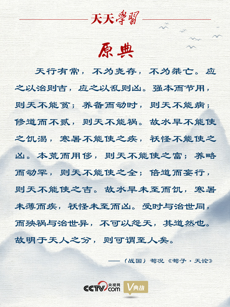 “天行有常”,“应之以治则吉”,出自《荀子·天论》开篇首句“天行有常,不为尧存,不为桀亡。应之以治则吉,应之以乱则凶。”原文的意思是:大自然有自己的运行规律,这个规律不会因为尧的贤明而存在,也不会因为桀的暴虐而消亡。用合理的方法应对它,就会带来吉祥的结果;用不合理的方法应对它,就会招致灾祸。