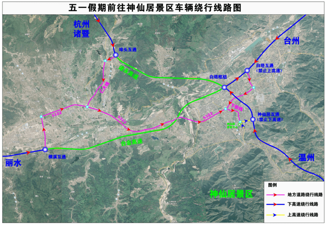 5月1日至5日,每天8时至14时的大流量时段,S26诸永高速神仙居收费站双向出口关闭(只进不出),S28台金高速白塔收费站进口关闭(只出不进),在该时段前往神仙居景区及过境的车辆从台金高速白塔或其他相邻收费站驶离高速,前往神仙居景区通过S322省道进入,游玩结束后从诸永高速神仙居收费站进入高速。
