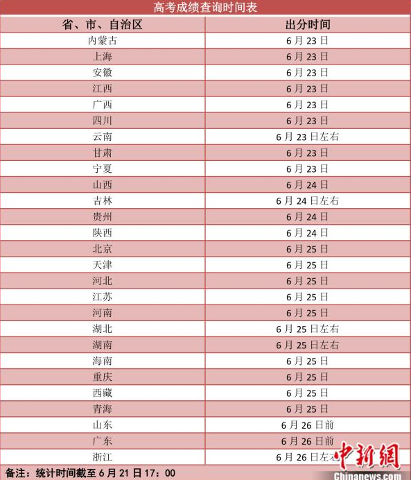 更多的省份,如北京、天津、河北、江苏、河南、湖北、湖南、海南、重庆、西藏、青海等十余省份将集中在25日公布考生成绩。